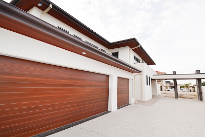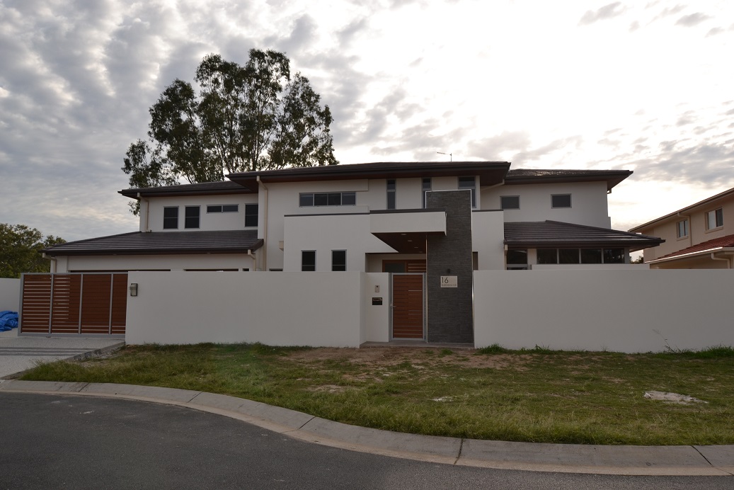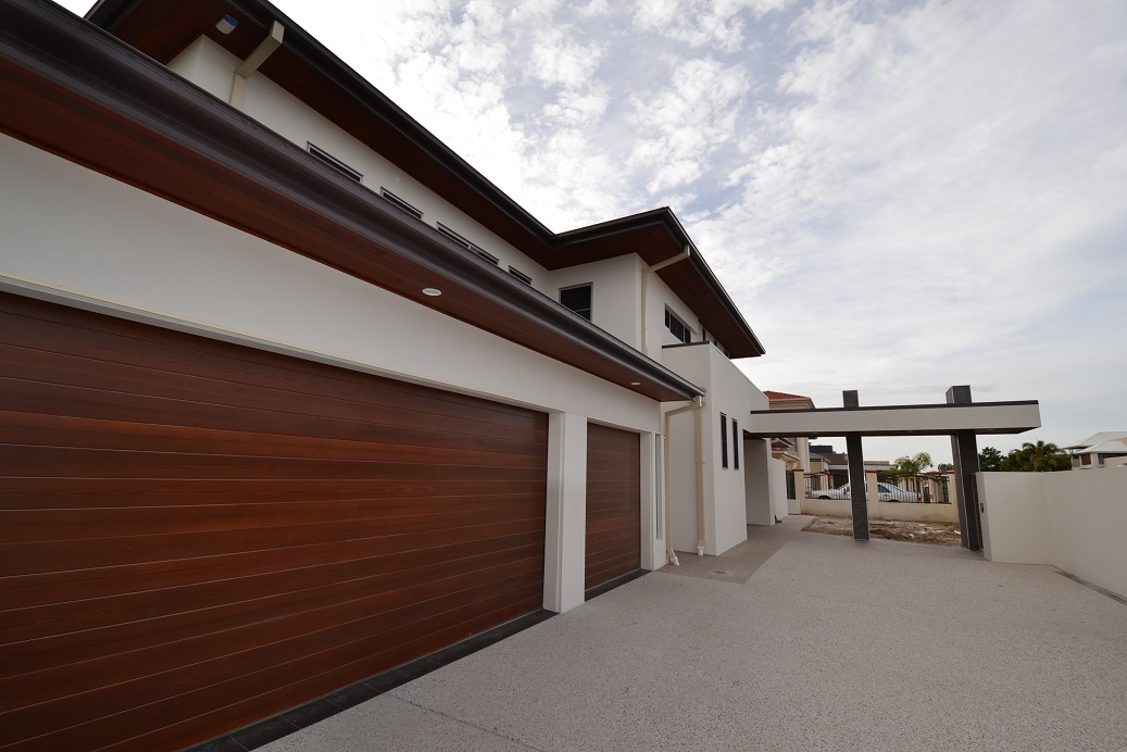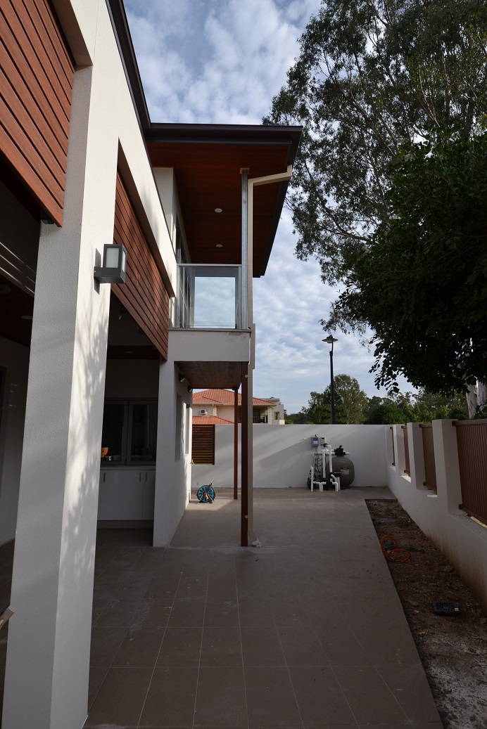 A contemporary two-storey residence defined by clean lines, broad roof overhangs, and expansive glazing. The architecture emphasizes indoor–outdoor living, with upper-level balconies, ground-floor living spaces opening to a landscaped terrace, a swimming pool, and a private putting green. Timber soffits, glass balustrades, and crisp white finishes create a modern, light-filled home designed for relaxed, refined living.